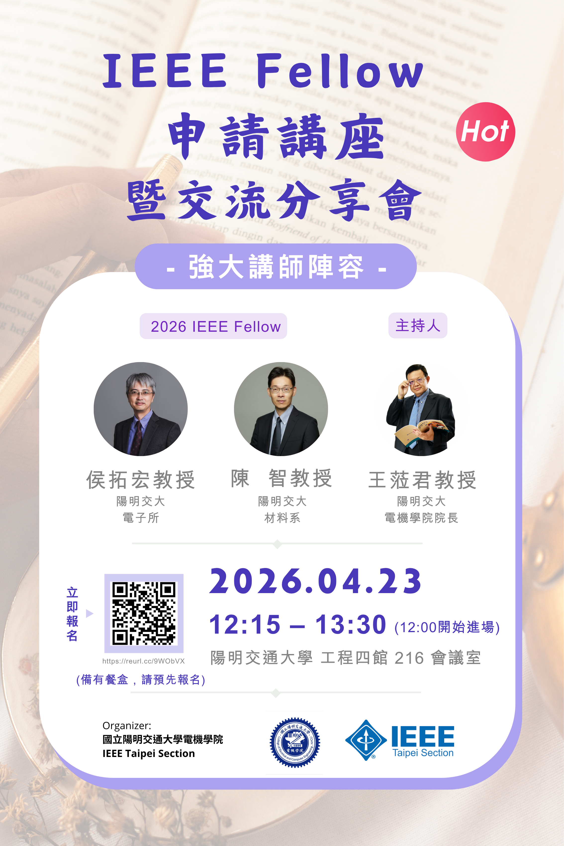 為了協助更多優秀會員瞭解 Fellow 的申請流程、撰寫技巧及評選關鍵,IEEE Taipei Section 特別邀請兩位剛榮膺 2026 IEEE Fellow的重量級講者——侯拓宏教授與陳智教授,親自現身說法,與大家分享申請過程中的寶貴心法與寶貴經驗。