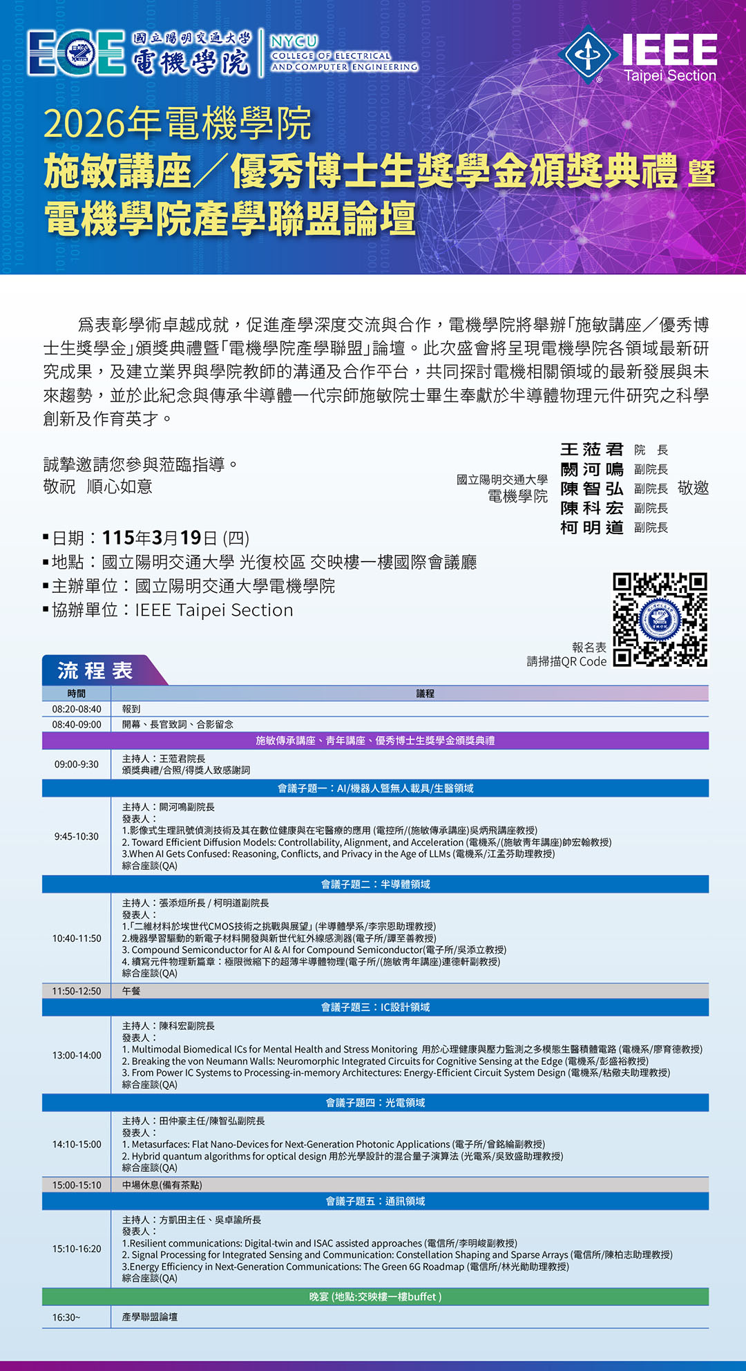 2026/03/19 傳承半導體傳奇:敬邀參加 電機學院 2026年「電機學院產學論壇」暨「施敏講座頒獎」